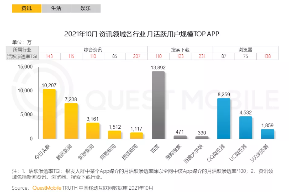 用户很好理解,任何媒体平台,没有用户就没有价值。值得关注的是这份报告中对内容和商业这两大维度的诠释,全面且成体系化,具备很强实践价值。 该模型对内容的评价不仅仅是内容的质量,还包括内容的广度和生态建设,而商业价值包括转化路径和全场景覆盖,这都是之前我们在评估媒体价值时容易忽略的。 当我们用这一套体系去看百度的时候,就会发现,百度的确已经不再是一个搜索引擎,而是一个具备极高营销价值的媒体平台。 无独有偶,前两日QuestMobile发布的一份“银发经济”洞察报告也特别提到,百度成为银发一族主动搜索、获取资讯最常用的工具,月活用户规模高于今日头条、腾讯新闻等各大新闻APP。