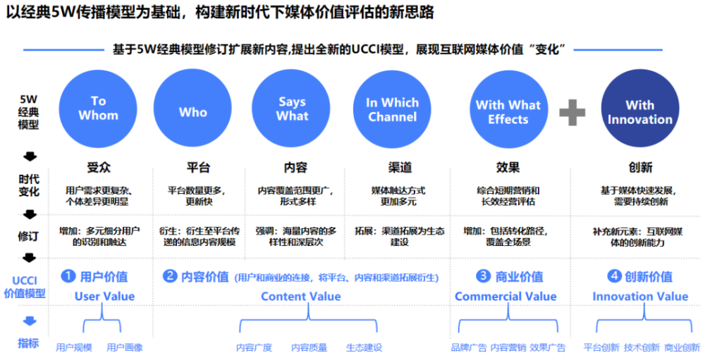 新时代下媒体价值评估新思路近日,百度营销联合益普索发布了一份《百度APP媒体价值研究》报告,该报告在经典5W传播模型基础上,构建了新时代下媒体价值评估的UCCI模型,提出用户、内容、商业和创新4个价值维度。