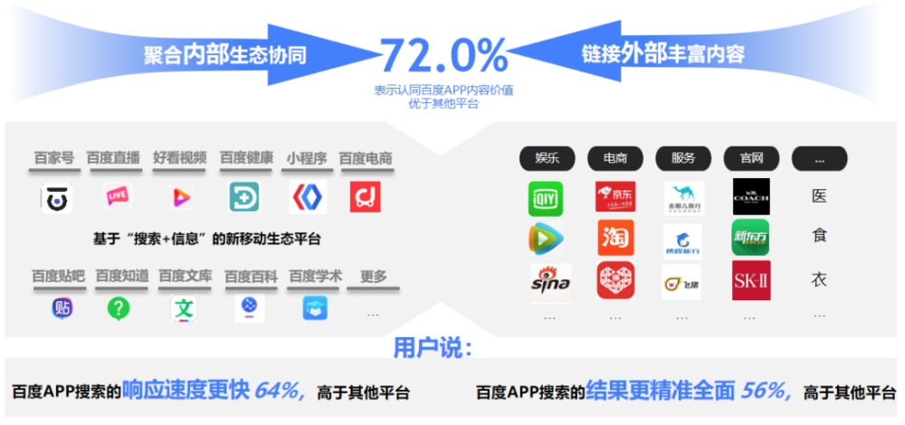 在“主动搜索”消费场景下,百度APP“丰富而精准的信息”可以促进用户的高效转化。关于一款产品,无论是其背后原理、功能、品牌选择还是口碑评价的信息,你都可以在搜索引擎上获得,且这些内容会以文字、视频、图片等多元的形式呈现。 可以说,百度是很多人主动了解一个新品牌、产品的第一步,而搜索返回的信息可以帮助用户二次细化自身需求。 报告还显示,超过六成的决策用户会从百度进入品牌官方阵地购买商品,因为百度的官方认证让他们有更强的信任感。信任就是媒体的权威性,而媒体的权威性,其实就是其占有信息量的体现。一个媒体占有信息越多,就越有权威性。通过百度的搜索引擎,用户可以触达互联网上最广阔的信息,从这个意义上,百度的权威性要高过单一媒体平台。这种权威性赋予用户信任感,在商业价值变现中,就成为打开消费者心智的钥匙。 最后: 从PC时代的以搜索为核心,到移动生态对生活场景的全面覆盖,百度正从一个搜索工具变成一个与用户密切相连的媒体平台。它提供的不仅有工具价值,还有更多的情感价值。 百度正通过对不同用户需求场景的全面覆盖,触达用户生活的方方面面,让自己变成了一个时时刻刻为用户提供智能决策的综合性内容与服务平台。