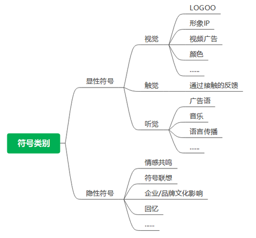 符号的设计和记忆,并不仅仅是差异化的判断,它是品牌/产品对自身价值的挖掘,以及市场、消费者深度的心理链接。 二、符号类别符号可以分为两个大类:显性和隐性。 显性符号:即,具有清晰明显的识别特征,看得见,摸得着,能被实际感知到。比如:视觉设计的LOGO、形象IP、广告音频等;实际的产品,通过触摸、使用等。 隐性符号:通过对显性符号的内化,转变为潜在的意识符号,通过某些线索,可以被唤醒,从而能引起情感共鸣,甚至生理的变化。比如:想到“酸梅”,条件反射的会生出津液,大脑传递出酸涩的信号;听到某个品牌的名字,引起的情感共鸣和企业文化等。